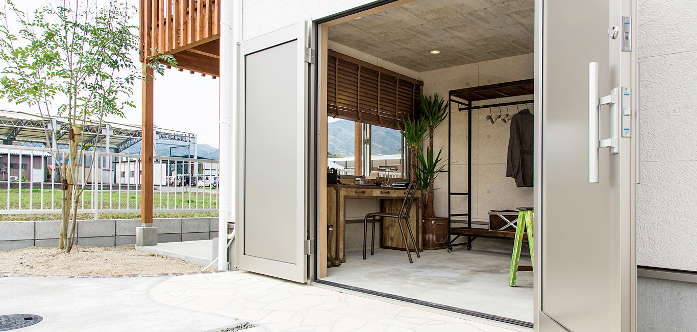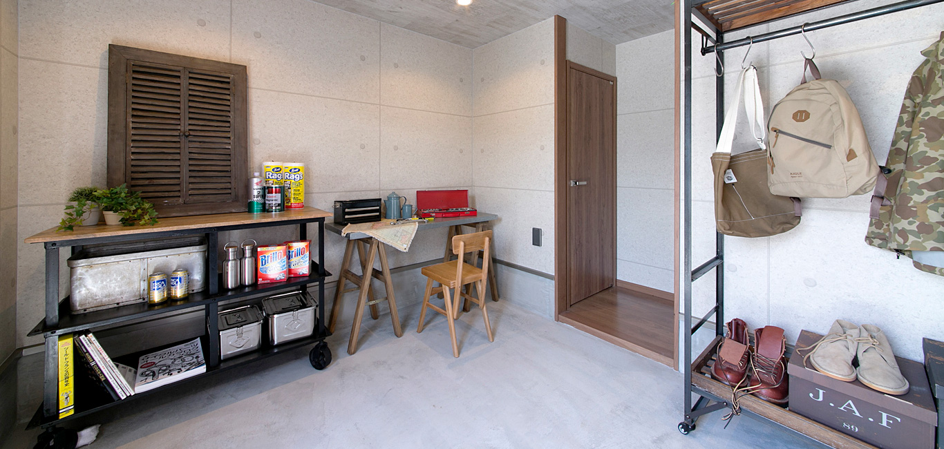 玄関とは別に、シューズインで外から出入りできるアウドアスペースを作りました。こだわりの自転車やバイクを持ち込んだり、D.I.Yに専念したり。贅沢に趣味を満喫できる土間スペースとして活用できます。
