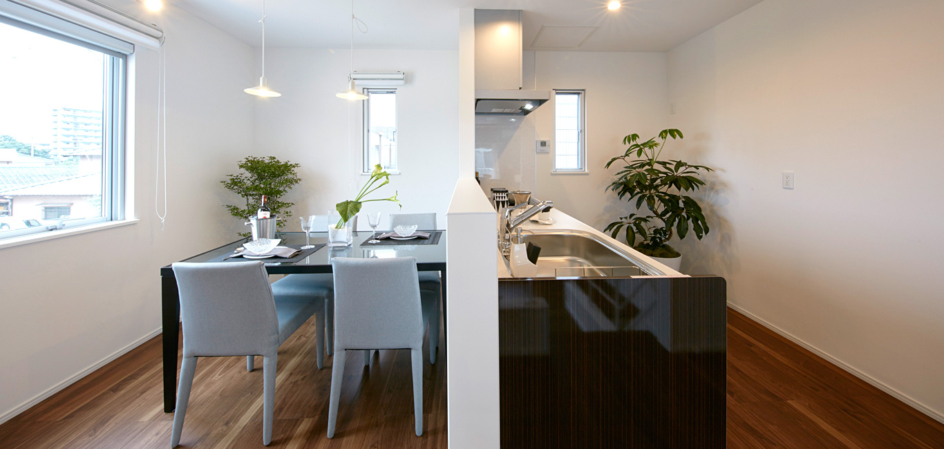 ダイニングと連動しながら、リビング全体を見渡すことができるステップアップ・キッチンです。家族を見守りやすく、お料理にも専念できます。